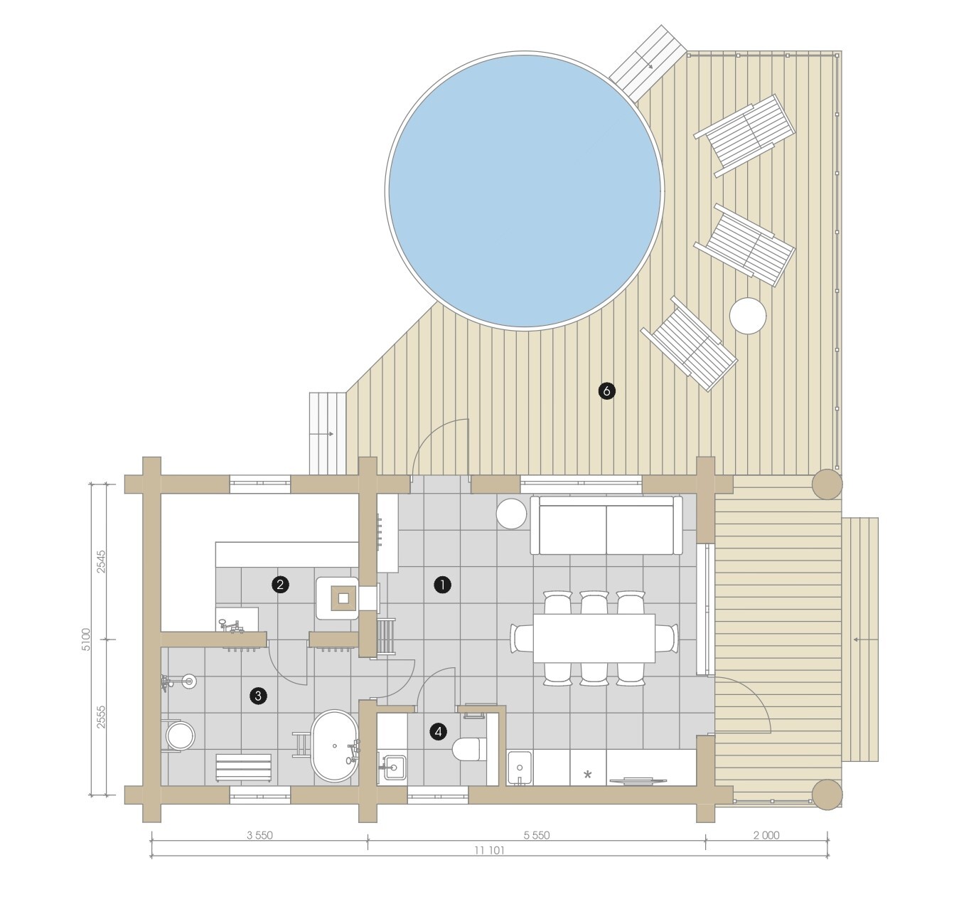 Наибольшее внимание приковывает к себе круглый бассейн снаружи, вокруг которого разместилась зона отдыха. Здесь будут и шезлонги, и зонтики – всё для отличного загородного отдыха летом!