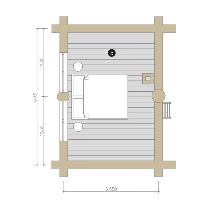 В ней есть всё необходимое для комфортного отдыха. Парная и моечная, комната отдыха и санузел. Имеется также антресольная спальня, где можно расслабиться после парения. Экстерьер выполнен в традиционном стиле. Есть большие окна и панорамная дверь.