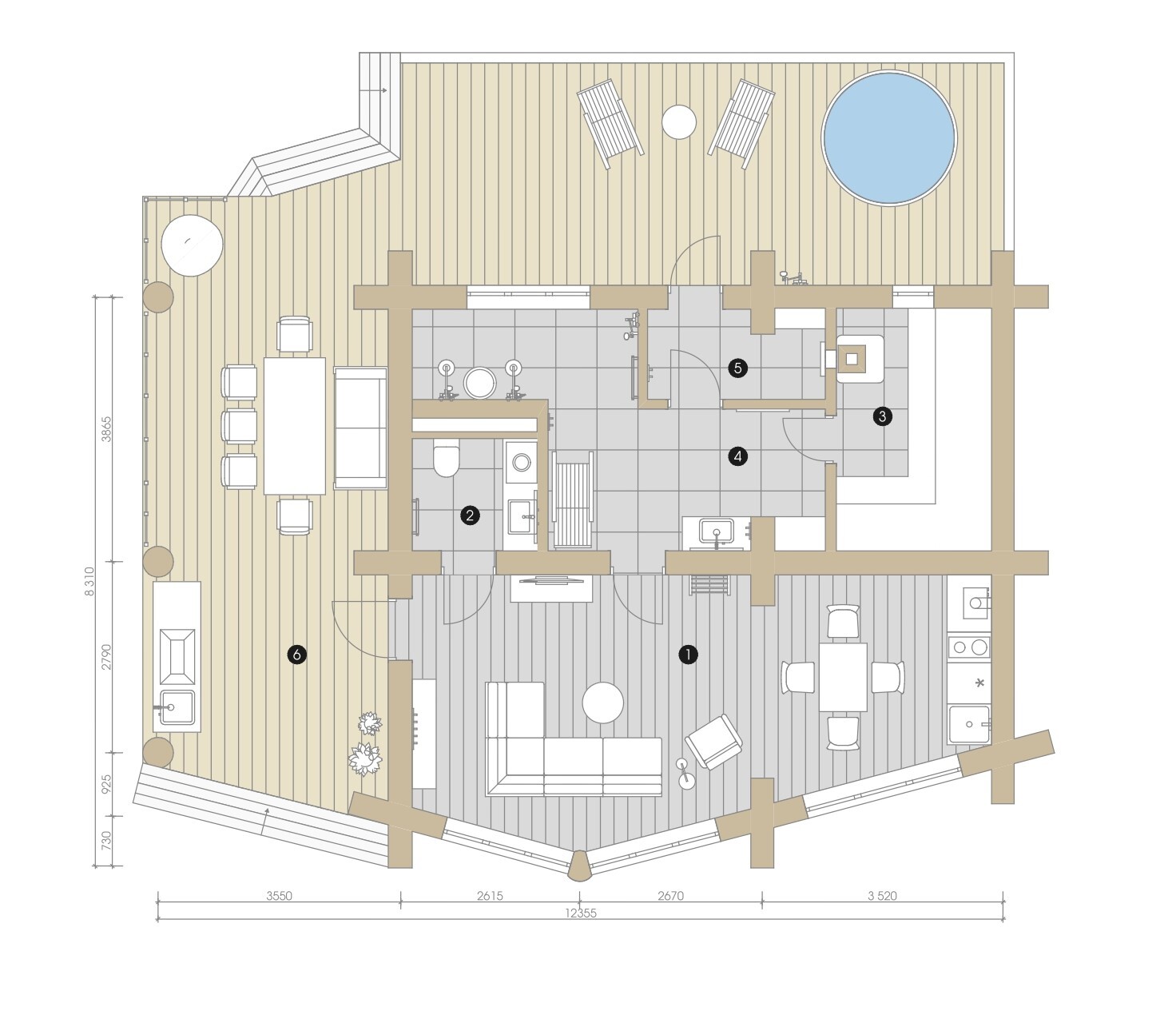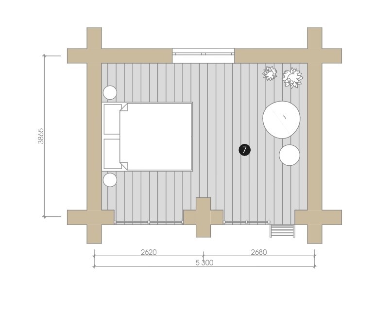 1. моечная 7,9 м²; 2. парная 8,2 м²; 3. душевая 5,1 м²; 4. санузел 3,2 м²; 5. топочная с отдельным входом со внешней стороны 2,9 м²; 6. комнаты отдыха 18,7 м²; 7. кухонная зона 9,2 м²; 8. открытая терраса в 61,05 м²